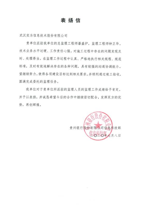 實為公司承擔(dān)貴州銀行股份有限公司總行辦公大樓安防及智能化設(shè)計建設(shè)項目監(jiān)理服務(wù)過程中,嚴格執(zhí)行相關(guān)規(guī)范標(biāo)準(zhǔn),及時有效解決項目存在的各種問題,獲得業(yè)主單位的充分肯定。