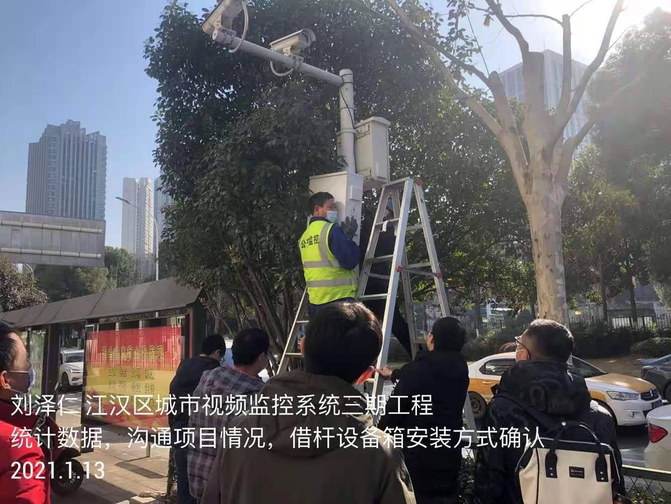圖為武漢實為公司現場工程師統(tǒng)計數據、和施工方溝通項目進展情況及借桿設備箱安裝方式的確認