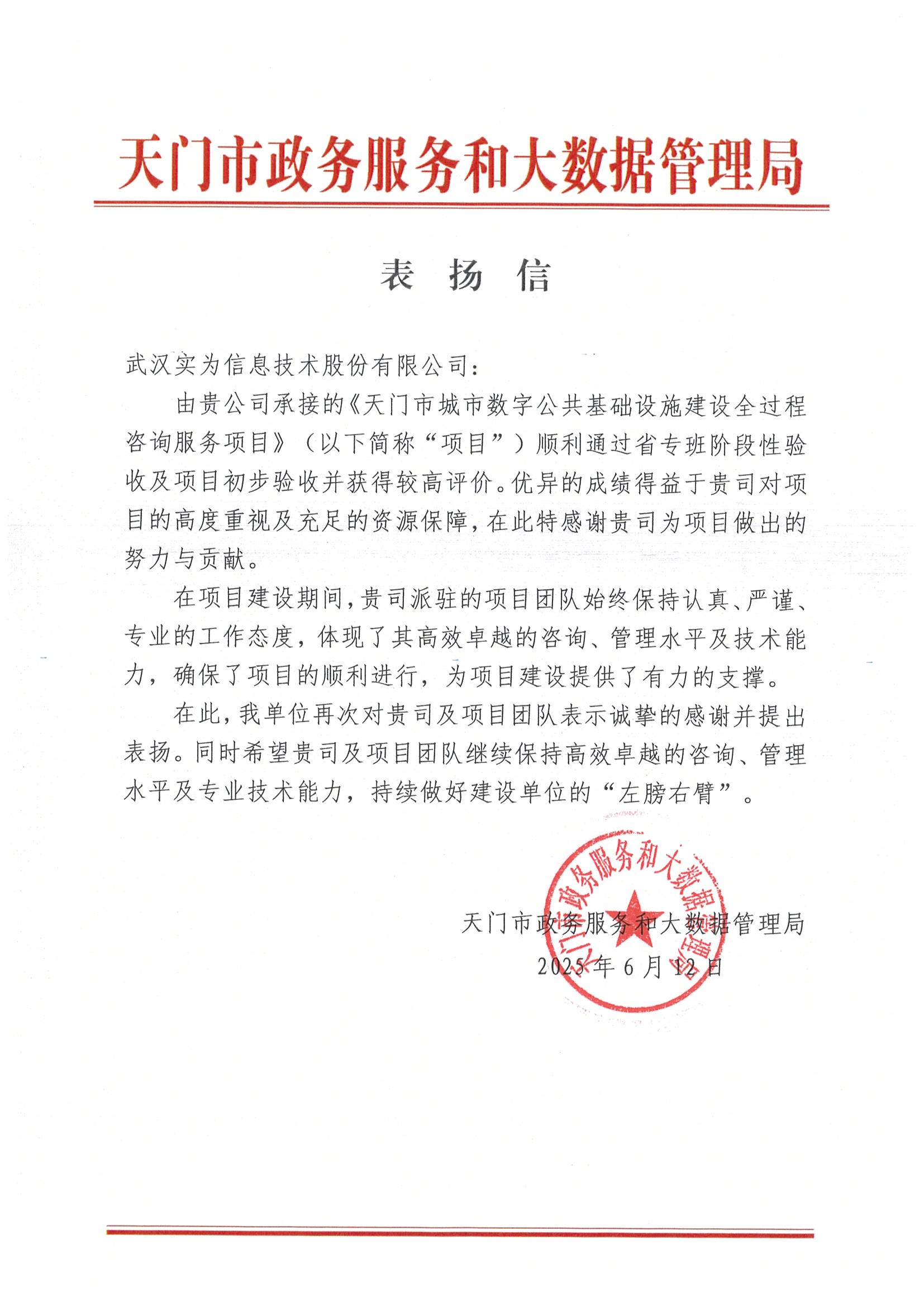 實(shí)為公司獲得天門市政務(wù)服務(wù)和大數(shù)據(jù)管理局表揚(yáng)