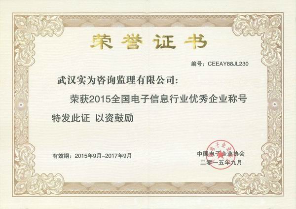 熱烈慶祝武漢實為咨詢監(jiān)理公司榮獲2015年全國電子信息行業(yè)優(yōu)秀企業(yè)。我公司為湖北唯一當(dāng)選的信息系統(tǒng)咨詢監(jiān)理服務(wù)機(jī)構(gòu)。希望各位同事百尺竿頭更上一樓,不斷突破自我、追求卓越,成為全國領(lǐng)先的一流的信息技術(shù)服務(wù)機(jī)構(gòu)。