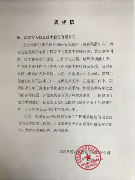 實(shí)為公司員工通過自身的業(yè)務(wù)水平、責(zé)任心、組織協(xié)調(diào)能力在沙湖碼頭候船廳(游客集散中心)項(xiàng)目中獲得業(yè)主單位好評(píng),并獲得各方認(rèn)可。實(shí)為公司會(huì)一直秉承實(shí)為理念,傳遞認(rèn)真負(fù)責(zé)的工作態(tài)度,更好的為各項(xiàng)目提供服務(wù),獻(xiàn)計(jì)獻(xiàn)策。