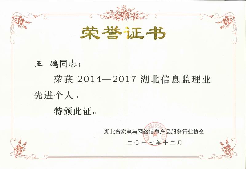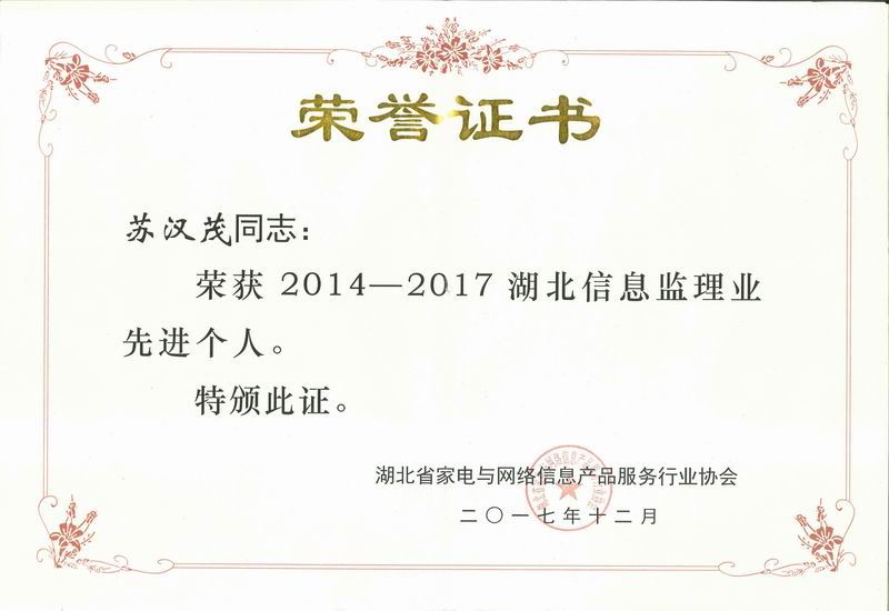 根據(jù)湖北省家電與網(wǎng)絡(luò)信息產(chǎn)品服務(wù)行業(yè)協(xié)會(huì)2017年12月15日發(fā)布的《關(guān)于開展2014-2017年優(yōu)秀單位及先進(jìn)個(gè)人評(píng)選活動(dòng)的通知》,公司積極參與協(xié)會(huì)活動(dòng),經(jīng)協(xié)會(huì)會(huì)長(zhǎng)辦公會(huì)審核決定,咨詢部負(fù)責(zé)人蘇漢茂、平安城市事業(yè)部負(fù)責(zé)人王鵬被評(píng)為“湖北信息監(jiān)理先進(jìn)個(gè)人”。