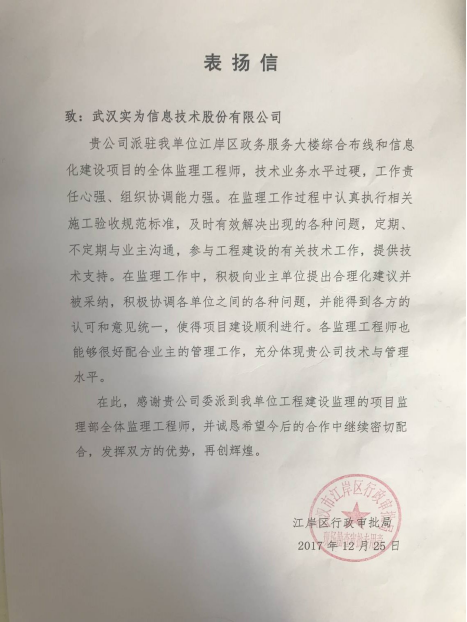 實(shí)為公司員工通過自身的業(yè)務(wù)水平、責(zé)任心、組織協(xié)調(diào)能力在江岸區(qū)政務(wù)服務(wù)大樓綜合布線和信息化建設(shè)項(xiàng)目中獲得業(yè)主單位好評(píng),并獲得各方認(rèn)可。實(shí)為公司會(huì)一直秉承實(shí)為理念,傳遞認(rèn)真負(fù)責(zé)的工作態(tài)度,更好的為各項(xiàng)目提供服務(wù),獻(xiàn)計(jì)獻(xiàn)策。