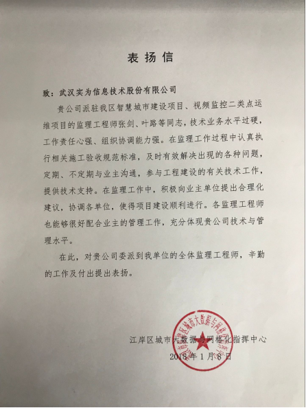 實(shí)為公司員工通過(guò)自身的業(yè)務(wù)水平、責(zé)任心、組織協(xié)調(diào)能力在智慧城市建設(shè)項(xiàng)目、視頻監(jiān)控二類點(diǎn)運(yùn)維項(xiàng)目中獲得業(yè)主單位好評(píng),并獲得各方認(rèn)可。實(shí)為公司會(huì)一直秉承實(shí)為理念,傳遞認(rèn)真負(fù)責(zé)的工作態(tài)度,更好的為各項(xiàng)目提供服務(wù),獻(xiàn)計(jì)獻(xiàn)策。
