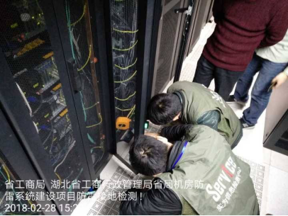 雷擊可以產生不同的破壞形式,國際電工委員會已將雷電災害稱為“電子時代的一大公害”,雷擊、感應雷擊、電源尖波等瞬間過電壓已成為破壞電子設備的罪魁禍首。機房防雷接地,是保障設備安全、操作人員安全和設備正常運行的必要措施。可以認為,凡是與電網連接的所有儀器設備都應當接地;凡是電力需要到達的地方,就是接地工程需要作到的地方。由此可以我們知道,監(jiān)控系統(tǒng)防雷接地工程的廣泛和重要。下圖為實為檢測人員對湖北省工商行政管理局機房防雷接地進行檢測。